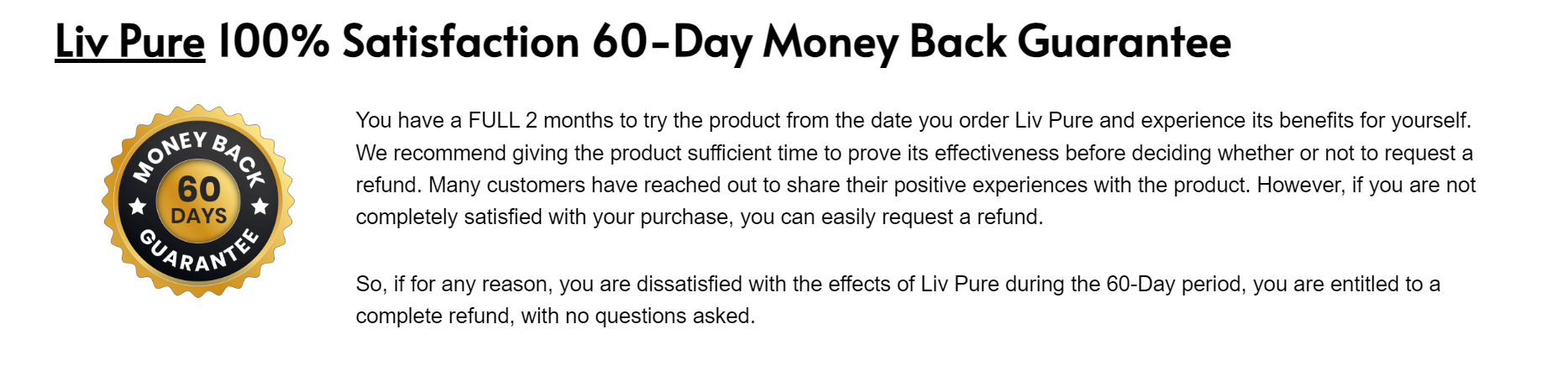 LivPure is a dietary supplement that promises to help you dissolve belly fat and achieve your desired body shape. While the manufacturers are confident about the effectiveness of this product, they also acknowledge that no supplement can have a 100% success rate. Therefore, they offer a personal 60-day money-back guarantee to every customer who purchases Liv Pure. This means that if you are not satisfied with the results, you can return the unused portion of the product and get a full refund without any questions asked. This guarantee ensures that you can try Liv Pure without any risk and make an informed decision about its suitability for your health goals.